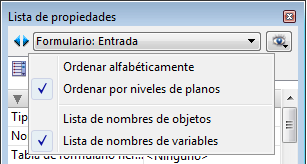 Plano: este botón está asociado a un menú que permite modificar el plano de los objetos en el formulario. Que esté activo o no, depende de los objetos seleccionados. Para mayor información, consulte Superponer objetos.