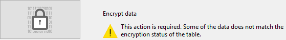 このメッセージは、少なくとも1つのテーブルに対して暗号化可能属性のステータスが変更されていて、データファイルがまだ暗号化されていないことを意味します。