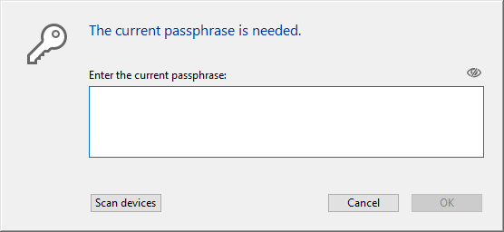 または - USB キーなどのデバイス(データ暗号化キーをファイルに保存する参照)を接続して、デバイスをスキャンボタンをクリックする