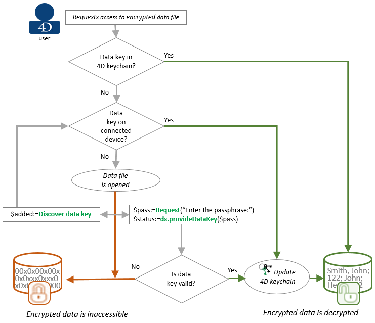 When the user tries to open an encrypted data file, 4D looks for a valid encryption key in the 4D keychain. If found, access (read/write) to the encrypted data is granted.