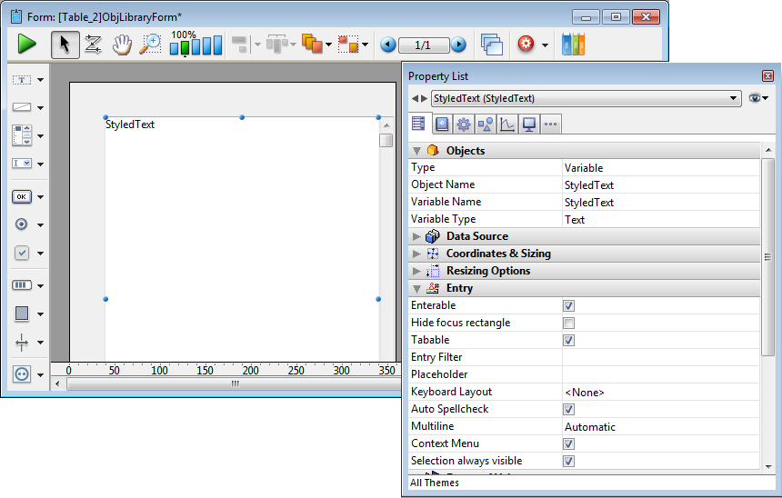 Adds a styled text area (variable) where you can set the character font and define its size and color. This area can be resized and has a vertical scroll bar and a context menu. You can modify these default features using the Property list.