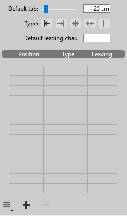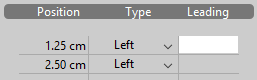 You can change individual tab stops and leading characters manually in the list by entering a new Position value directly in the cell and/or choosing a new Type from the drop-down menu: