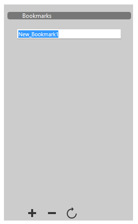 button at the bottom of the panel: a "New_Bookmark1" label appears in the list. You can rename a bookmark at any time; clicking on a bookmark that is highlighted in the list switches its label to editing mode. Bookmark names must be comprised of standard alphanumeric characters.
