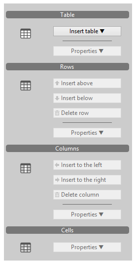 This panel manages tables in the 4D Write Pro area. You can insert a table, add and remove rows and columns, and define the properties of the table, rows, columns, or individual cells.