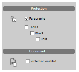 To prevent modification of the protected part(s), select the Protection enabled option in the Document section.