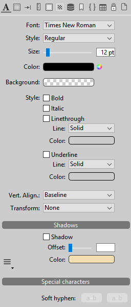 This panel manages standard font styles and properties for the text of the 4D Write Pro area.