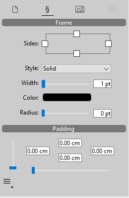 Frames can be set for the document as a whole and/or for individual paragraphs, or for pictures found in the text. You use the icons at the top of the panel to configure these settings separately for the desired area: i.e.,