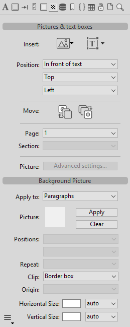 This panel manages pictures, text boxes, and background pictures for the 4D Write Pro area.