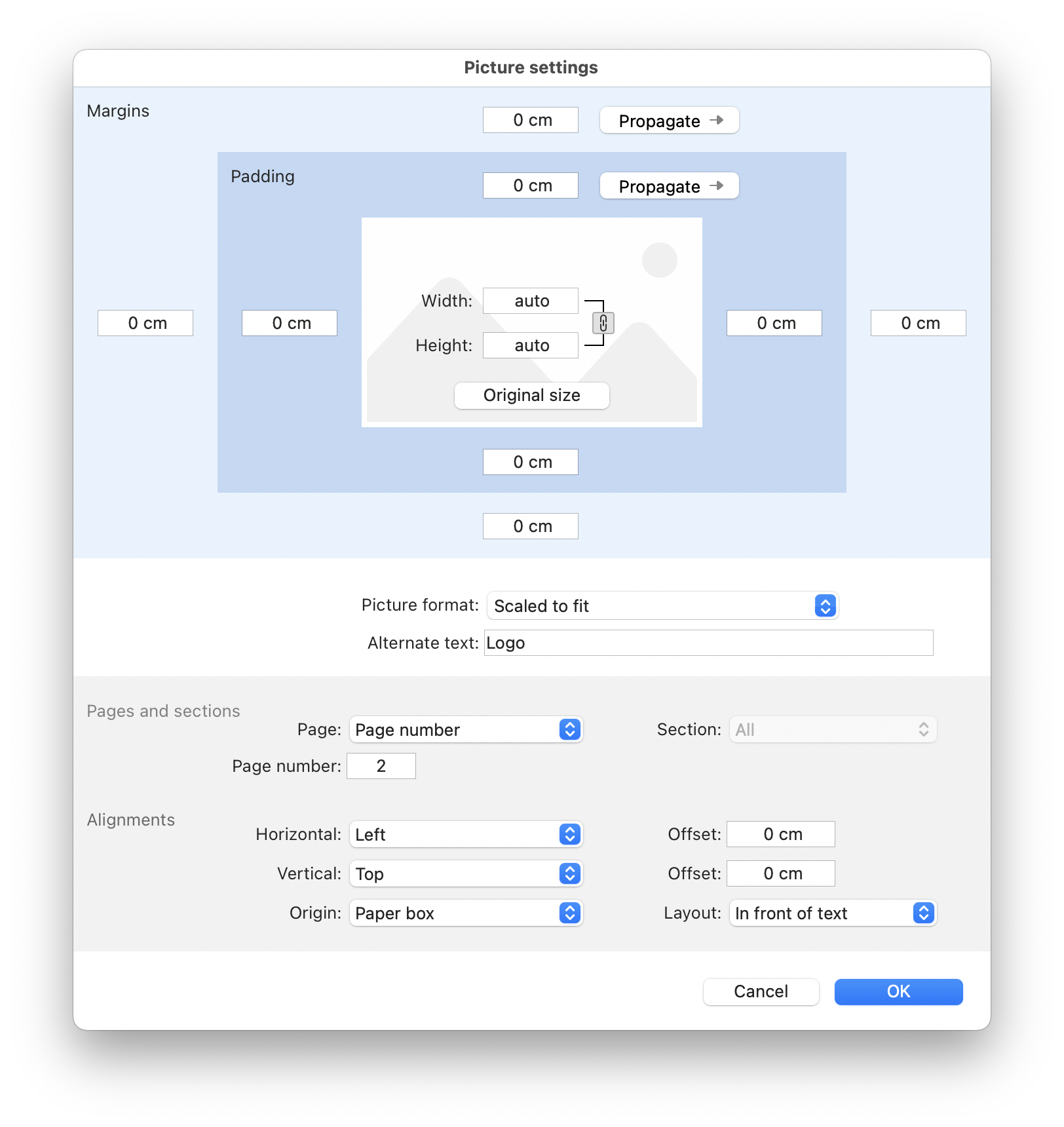 Click Advanced settings... (pictures only) to open a dialog box in which you can set the size and advanced options for the selected picture.