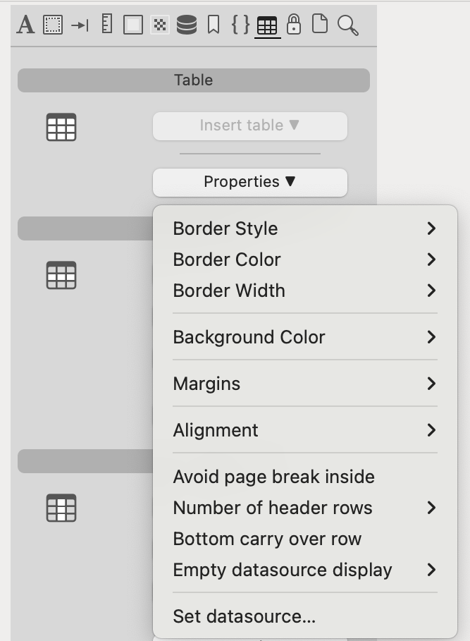 In Insert table you can choose between one of the proposed template tables and modify it using the properties menu, or choose the Wizard table that appears at the end of the list to further simplify the table creation process. See the Table Wizard documentation for more details.