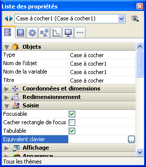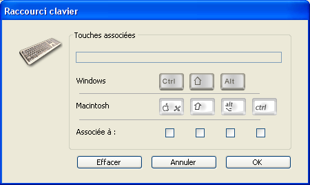 La Liste des propriétés indique l’équivalent clavier associé à l’objet. Si vous souhaitez par la suite changer l’équivalent clavier, vous pouvez le faire à tout moment en ouvrant le dialogue de définition des touches associées puis en appuyant sur les touches que vous souhaitez utiliser.