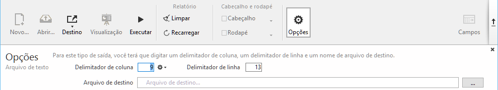 Quando o destino do relatório é estabelecido como "Arquivo", as opções abaixo estão disponíveis: