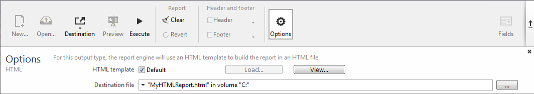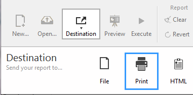 The destination selection window appears where you can choose one of the following: File, Print or HTML.