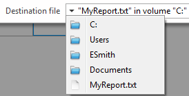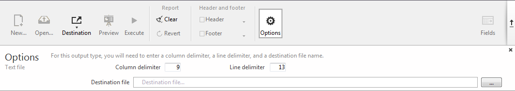By default, 4D uses the character 9 (tab) for column delimiters and 13 (carriage return) for line delimiters. - Destination file: Used to set a name and destination for the file generated. The name and location entered will be proposed by default when the report is executed.
