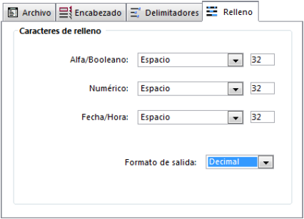 Esta página sólo aparece cuando el formato de archivo es texto de longitud fija. Permite definir el carácter de relleno a utilizar para cada tipo de datos. El carácter de relleno por defecto es el espacio.