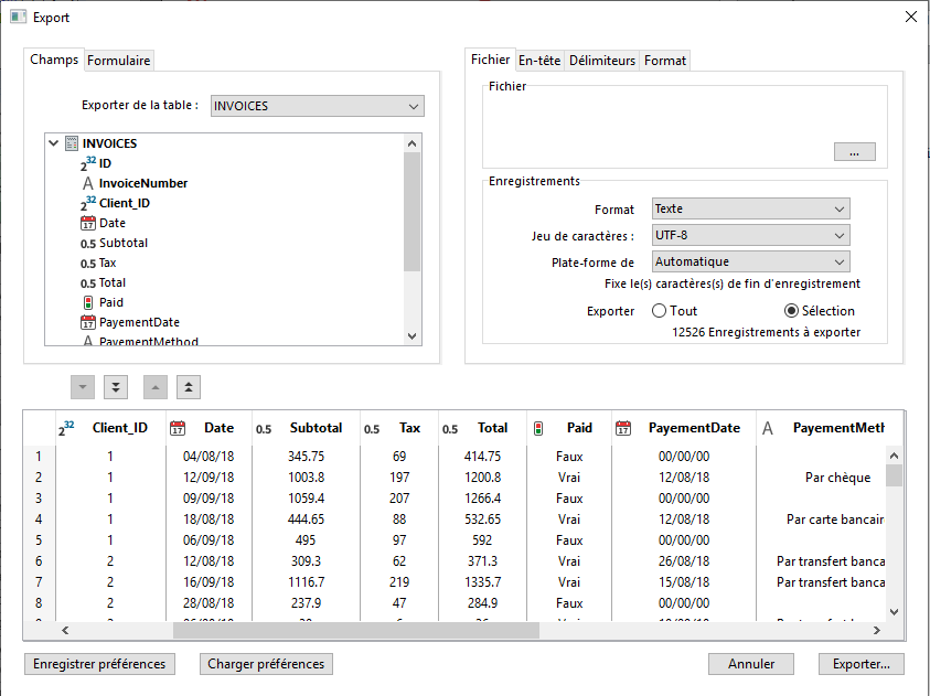 Dans la zone “Enregistrements”, indiquez si vous souhaitez exporter la totalité des enregistrements de la table sélectionnée (option Exporter tout) ou uniquement la sélection courante (option Exporter sélection). Dans les deux cas, le nombre d’enregistrements concernés est affiché dans la zone.