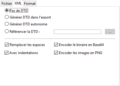 Générer DTD dans l’export : permet de générer une DTD et de l'inclure dans le fichier XML lui-même (DTD interne). Le fichier XML généré est alors autonome.