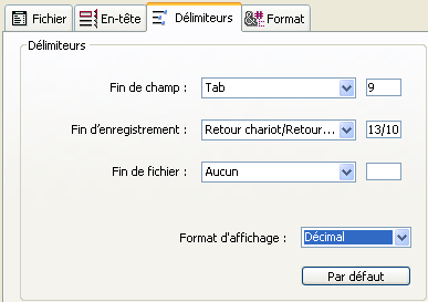 Les délimiteurs sont détaillés dans la section Délimiteurs de fichiers, de champs et d’enregistrements. Pour modifier les délimiteurs, vous pouvez utiliser les menus déroulants, contenant les valeurs les plus couramment utilisées pour chaque type de délimiteur. Vous pouvez également saisir directement les délimiteurs dans les zones de droite. Le menu situé en bas de la page vous permet de visualiser les délimiteurs dans différents formats : Caractère, Décimal (format par défaut) et Hexadécimal.