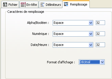 Cette page n’apparaît que lorsque le format de fichier est “Texte Longueur fixe”. Elle permet de définir les caractères de remplissage à utiliser en fonction du type de valeurs.