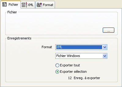 Dans la zone “Enregistrements”, sélectionnez le format du fichier d’export — Texte, Texte longueur fixe, DIFF, SYLK, DBF, 4D Application ou XML et ses options de formatage (cf. section Formats des fichiers d’échange).
