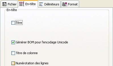 Générer BOM pour l'encodage Unicode : insère dans l’en-tête du fichier d’export une marque d’ordre des octets (Byte Order Mark ou BOM). Cette information supplémentaire facilite l’interprétation du texte par le logiciel d’import, s’il prend en charge cette fonction. Cette option est cochée par défaut. Elle n’est prise en compte que si un jeu de caractères Unicode est sélectionné pour l’export. Dans le cas contraire, aucune BOM n’est ajoutée.