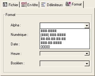 Des caractères de remplissage peuvent être utilisés pour trois types de valeurs : Alpha/Booléens (les booléens sont importés en tant qu’alpha), Numériques et Date/Heure. Les menus vous proposent les valeurs les plus couramment utilisées. Les zones de saisie situées à droite affichent les caractères sélectionnés. Si vous souhaitez utiliser d’autres caractères, saisissez-les directement dans les zones.