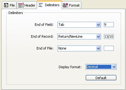区切り文字 (デリミター) については、フィールド、レコード、ファイルの区切り文字で詳しく説明しています。デフォルトの区切り文字を変更するには、ドロップダウンリストに表示される、各区切り文字として最も頻繁に用いられる値から選択します。また、右側の入力エリアに区切り文字を直接入力して指定することも可能です。
