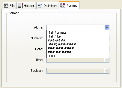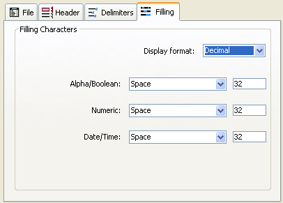 文字/ブール (ブールフィールドは文字として読み込まれます)、数字 (整数、倍長整数、実数)、日付/時間という3つのデータタイプに対して、異なる埋め文字を使用することができます。通常、固定長形式のフィールドを埋める場合は空白文字が用いられます。ドロップダウンリストには、それ以外の選択肢が提示されています。右側の入力エリアには、選択した埋め文字が表示されます。他の文字を使用したい場合、その文字を入力エリアに直接入力してください。