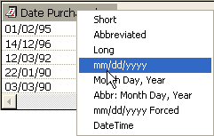 プレビューエリアから、文字、数字、日付、時間、ブールタイプのフィールドに対し、書き出し用フォーマットを設定することができます。プレビューエリアでカラムを選択すると、データタイプに対応するするコンボボックスが利用可能になります。コンボボックスからフォーマットを選択するか、 (文字、数字、ブールデータタイプの場合は) 独自のフォーマットを直接入力します。4Dの表示フォーマットについての詳細は、表示フォーマットを参照ください。