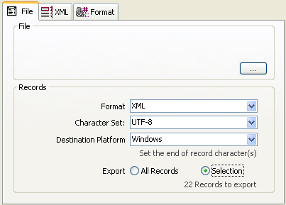 2. ファイルページの"レコード"エリアにて、書き出しファイルのフォーマットを選択します。テキスト固定長テキストDIFDBFSYLKXML4IE のなかから選択し、必要に応じてそれらのフォーマットオプションも設定します (ファイルフォーマット参照)。
