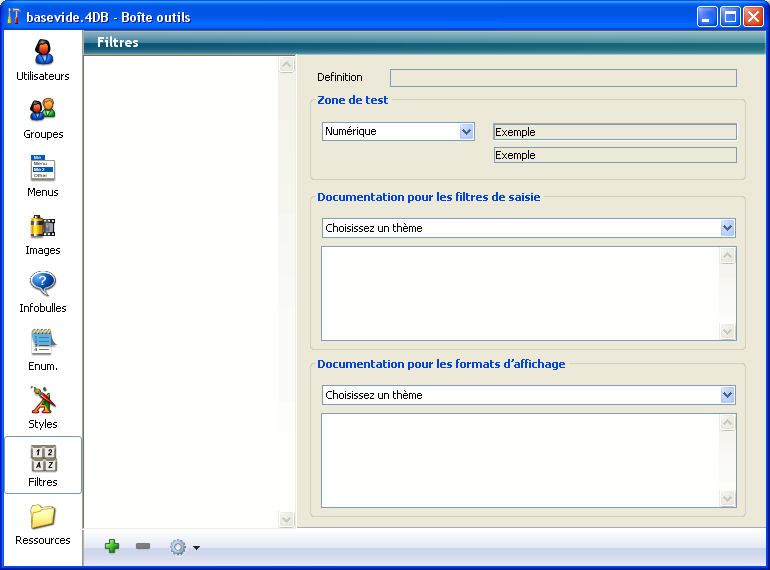 Vous pouvez aussi créer des formats d’affichage correspondant aux filtres de saisie et utiliser leurs noms pour les affecter aux mêmes endroits. Les formats d’affichage et les filtres de saisie personnalisés sont créés dans la page Filtres de la Boîte à outils de 4D :