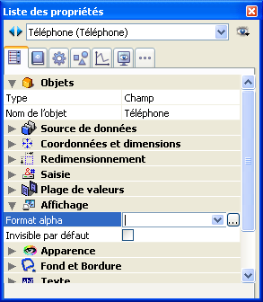 Les formats alphanumériques par défaut sont accessibles via la Liste des propriétés (thème "Affichage"). Vous pouvez choisir un format dans cette liste ou le saisir ou le modifier dans la combo box associée. Vous pouvez également sélectionner le nom d’un format personnalisé défini dans la fenêtre de l’éditeur de Filtres et formats. Dans ce cas, le format n’est pas modifiable dans les propriétés de l’objet. Vous pouvez accéder à l’éditeur en cliquant sur le bouton [...] situé à droite de la combo box des formats.