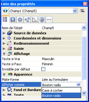 Vous définissez l’apparence du champ booléen (boutons radio ou case à cocher) à l’aide de la liste déroulante “Afficher comme” placée dans le thème “Apparence”. Une fois que vous avez choisi l’option Bouton radio, deux zones de saisie dans le thème “Affichage” vous permettent de saisir les libellés pour chaque valeur (Vrai et Faux par défaut).