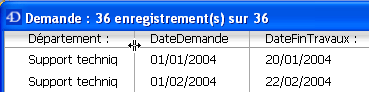 Vous pouvez redimensionner les colonnes des formulaires sortie (sauf si cette possibilité a été supprimée dans l’éditeur de formulaires). Pour cela, il vous suffit de placer le curseur de la souris au-dessus de la zone des titres des colonnes. Le curseur se transforme afin d’indiquer que la colonne est redimensionnable. Vous pouvez alors cliquer et déplacer la paroi de la colonne afin de la réduire ou de l’agrandir :