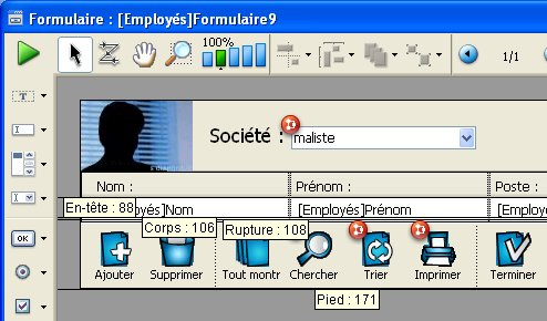La zone d’en-tête et/ou la zone de pied de page du formulaire peut contenir des boutons, pop up menus, etc.