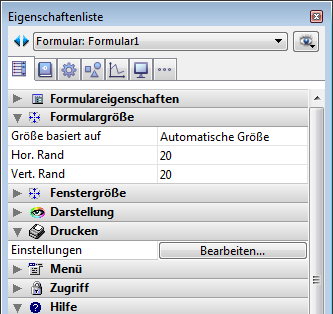 Dazu klicken Sie in der Eigenschaftenliste des Formulars unter der Gruppe “Drucken” auf die Schaltfläche Bearbeiten (siehe Formulareigenschaften).