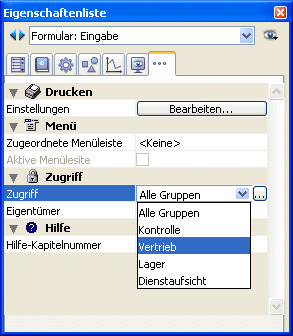 Sie können den Zugriff auf ein Formular steuern, indem Sie Zugriffs- und Eigentümerrechte für Benutzergruppen festlegen. Für jede Gruppe lassen sich unter dem Thema "Zugriff" Zugriff und Eigentümer festlegen. Weitere Informationen zum Erzeugen eines Kennwortsystems mit Benutzern und Gruppen finden Sie im Kapitel Benutzer und Gruppen.