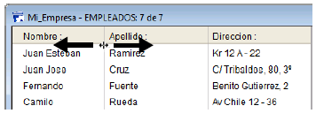 Puede redimensionar las columnas de los formularios de salida (excepto si esta posibilidad ha sido eliminada en el editor de formularios). Para hacerlo, coloque el cursor sobre el titulo de la columna; el cursor se transforma para indicar que la columna es redimensionable. Después puede hacer clic y mover la esquina de la columna para reducirla o aumentarla: