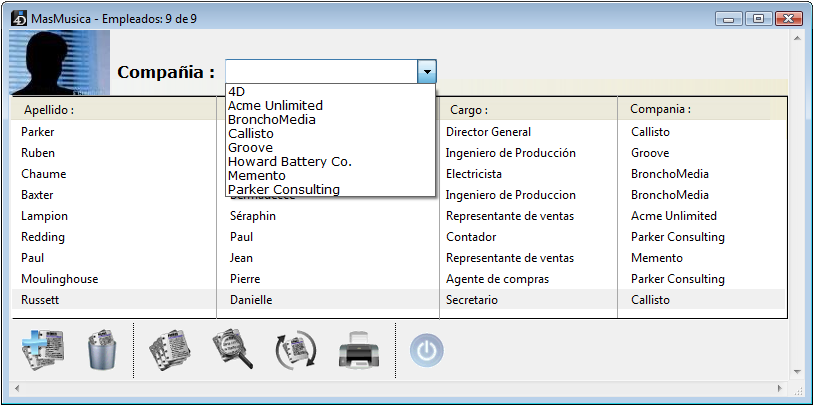 Los botones de control se han ubicado en el área de pie de página y una imagen personalizada se ha ubicado en el área de encabezado. El área de encabezado también incluye una lista desplegable que le permite seleccionar la empresa cuyos empleados quiere visualizar.