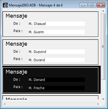 Este es un ejemplo de un formulario de salida de una base de datos de gestión de mensajes telefónicos la cual utiliza dos líneas por registro:
