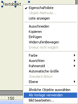 Klicken Sie auf ein Objekt, erscheint im Kontextmenü des Formulareditors der Eintrag Als Vorlage verwenden. Damit sichern Sie das angeklickte Objekt als Vorlage; erstellen Sie ein Objekt vom selben Typ, wird diese Vorlage mit den dazugehörigen Eigenschaften verwendet. Im folgenden Beispiel wird der Befehl auf ein Textobjekt angewandt. Alle anschließend erstellten Textobjekte verwenden die Eigenschaften des standardmäßig angelegten Objekts