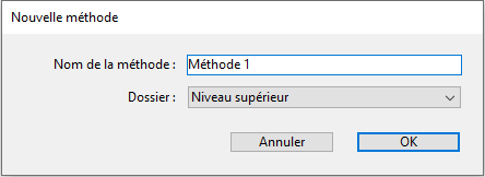 (Facultatif) Sélectionnez un dossier de stockage pour la méthode. Si vous sélectionnez un nom de dossier, la méthode sera placée dans ce dossier. Les dossiers permettent de classer les objets de vos applications et sont gérés dans la Page Démarrage de l’Explorateur. Par défaut, la méthode est créée au Niveau supérieur, c’est-à-dire en-dehors de tout dossier de stockage.