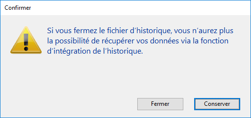 Si vous souhaitez fermer votre fichier d’historique courant parce qu’il devient trop important, il est préférable d’effectuer une sauvegarde du fichier de données, ce qui entraînera la sauvegarde de l’historique.