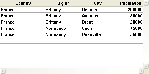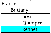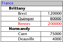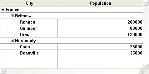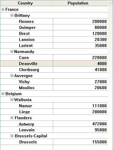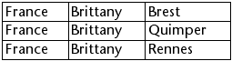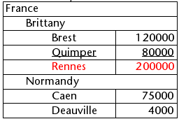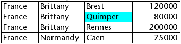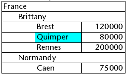 これらの配列が階層的に表示されると、2 つのブレーク行が追加されるため、"Quimper" 行は2 行目ではなく4 行目に表示されます:
