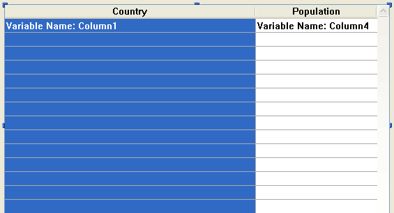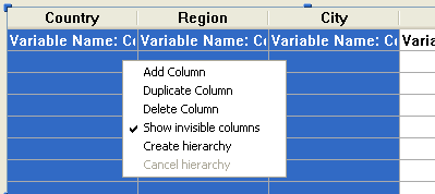 例: 左から国、地域、都市、人口列が設定されたリストボックスがあります。国、地域、都市が (下図の通り) 選択され、コンテキストメニューから階層を作成を選択すると、最初の列に3レベルの階層が作成され、二番目と三番目の列は取り除かれます。人口列が二番目になります: