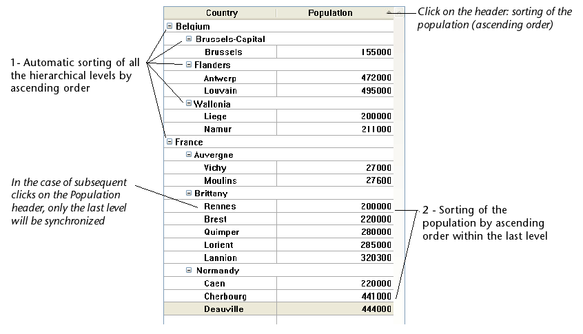 - その後の非階層列のソート時には、一番目の最後のレベルのみがソートされます。この列のソートはそのヘッダーをクリックすることで行えます。