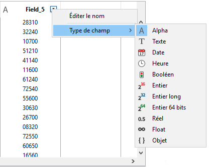 Créer une table pour importer les données du fichier. Pour cela, cochez l’option Créer une table. 4D crée alors une nouvelle table et les champs nécessaires, en fonction du contenu du fichier importé. Le programme détermine également le type de chaque champ. Vous pouvez renommer la table et les champs ; pour cela, double-cliquez sur le nom de la table ou du champ que vous souhaitez renommer dans la zone d'en-tête, ou cochez l’option d'en-tête Titre de colonne comme nom de champ (cf. paragraphe Page En-tête). Vous pouvez modifier le type des champs créés en cliquant dans la barre de titre du champ, dans la zone de prévisualisation : un pop-up menu vous propose les types disponibles : La table est créée au moment de l’import uniquement. Si vous annulez l’import ou désélectionnez l’option, la structure de la base reste intacte. Note : Vous pouvez désactiver cette option afin que les utilisateurs ne puissent pas créer de table dans la structure au moment de l’import. Pour cela, affectez un groupe d’accès au mode Développement dans la boîte de dialogue des Propriétés de la base — bien entendu, vous devez avoir activé le système de mots de passe dans 4D. Les utilisateurs n’appartenant pas à ce groupe ne pourront pas utiliser l’option Créer une table dans la boîte de dialogue d’import.