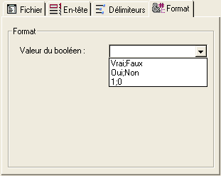 La syntaxe à appliquer est Valeur_Vraie;Valeur_Fausse. Si vous importez un champ de type booléen dont les valeurs sont, par exemple, “Noir” (valeur vraie) et “Blanc” (valeur fausse), vous pouvez saisir Noir;Blanc. La combo-box vous propose les types de formats booléens les plus courants.