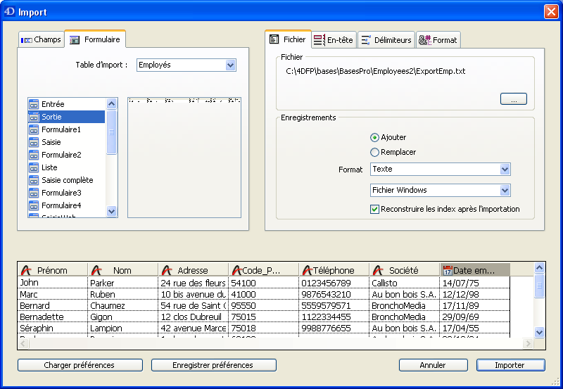 Note 4D Server : Il n’est pas possible d’importer des données à l’aide d’un formulaire comportant des méthodes dans une procédure stockée sur le serveur. En effet, les événements formulaire n’étant pas gérés sur le serveur, les méthodes associées ne seront pas appelées.