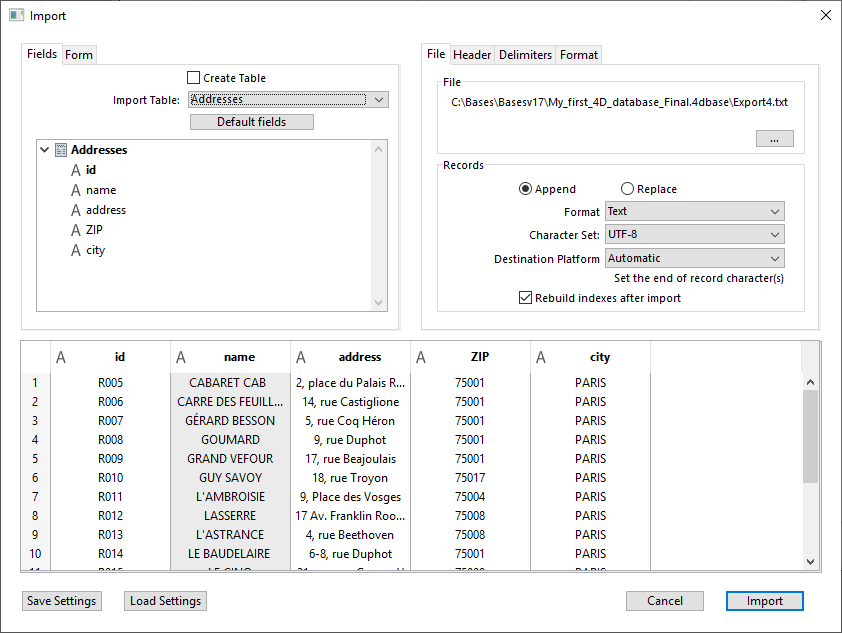 • Rebuild indexes after import: When this option is checked (by default), the indexes of the fields into which data is imported are rebuilt after the import. This mechanism can accelerate imports of large volumes of data. If the import concerns a quantity of data that is smaller than that already contained in the field, it may be useful to deselect this option before the import. In this case, the index is updated gradually and not rebuilt in its entirety.